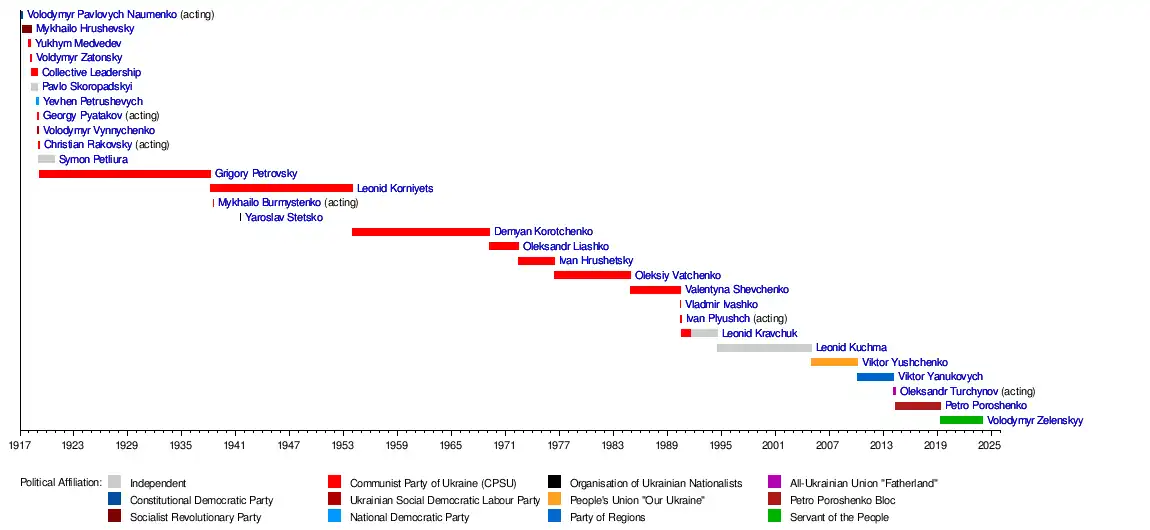 Volodymyr ZelenskyyPetro PoroshenkoOleksandr TurchynovViktor YanukovychViktor YushchenkoLeonid KuchmaLeonid KravchukIvan PlyushchValentyna Shevchenko (politician)Oleksiy VatchenkoIvan HrushetskyOleksandr LiashkoDemyan KorotchenkoYaroslav StetskoMykhailo BurmystenkoLeonid KorniyetsGrigory PetrovskySymon PetliuraChristian RakovskyVolodymyr VynnychenkoGeorgy PyatakovYevhen PetrushevychPavlo SkoropadskyiCommunist Party of Ukraine (Soviet Union)Yukhym MedvedevMykhailo HrushevskyVolodymyr Pavlovych Naumenko