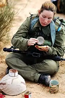 During peacetime, when Finnish Defence Forces conscripts are not provided with meals cooked either in garrisons or attached field kitchens, they are provided with rations (colloquially known as sissi rations) packed in a clear plastic bag. Several different menus exist, however all include foil-packed crispbread, coffee and tea, sugar, chocolate, small tins of beef or pork, chewing gum, dry porridge, energy drink powder, etc. Soups and porridges that are meant to be mixed with water and cooked are usually prepared in Trangia-type portable stoves that are shared by the pair in a fire and maneuver team, or in individual mess kits.