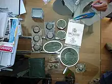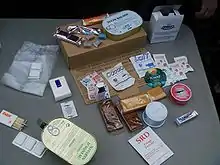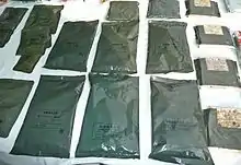 Most commonly it is packaged into a sturdy plastic blister box (nicknamed "The Frog" in the field for its olive-green color), or plastic-sealed cardboard box that contains five to six entrees in laminated foil cans or retort pouches, four to six pack of crackers or preserved bread, two to three dessert items in form of a spread or fruit bar, four beverage concentrate pouches, some seasonings (salt, pepper, sugar, ketchup), and various sundry items like sanitizing wipes/paper towels, spoons, can opener, four hexamine fuel tablets, folding heater, matches and water purifier tablets.[10] The types of entrees vary with the producer and the issued menu (of which there are usually 7 to 12), but the common set is based on a traditional Russian outdoorsmen fare, is largely formed out of the commercially available canned food, and usually includes 1 portion of stewed beef or pork, two meat-with-vegetables dishes, like various porridges, stews or canned fish, and one or two spreads, such as liver pâté, sausage stuffing or processed cheese. Desserts may include fruit jams, chocolate and/or walnut spreads, chocolate bars, sweetened condensed milk, etc., but baked goods are usually avoided out of concerns about their shelf life.[11] Other variants may add canned speck and/or dried fish or exchange the hexamine tablets for the flameless heater.