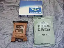 The People's Liberation Army's rations are of two types: Instant Meal Individual (three-item menu) and Self-Heating Individual (twelve-item menu) (Type 13 and 09). Sets of rations issued since 2018 consist of pre-packaged single-person meals sealed in hard plastic retort pouches.[40] A typical Chinese breakfast ration contains roughly 1,000 kcal (4,200 kJ) and includes a compressed food packet, an energy bar, an egg roll with pork, pickled mustard tuber, and a powdered beverage pack. Each Self-Heating Individual comes with an insulated flameless heater that is activated by water.[41]