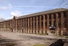 Notes: The Evans Mills produced high-quality 'Boar's Head' sewing cotton. Long Mill was built in 1782, operational in 1788, then burnt down in 1789 and was rebuilt in 1790. The top floor was used as a schoolroom for their child workers. It connects to West Mill (1821), Middle Mill (1804–05) and East Mill (1811). Separate is a Gassing Shed (1862) where the thread was singed, and the North Mill (1835). The free-standing engine house has been demolished but the chimney remains. [3]