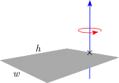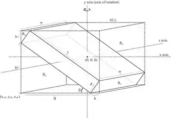 | Tilted solid cuboid of depth d, width w, and length l, and mass m, rotating about the vertical axis (axis y as seen in figure).
