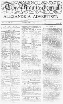 - 1 2 3 4 5 6 7 8 9 10 11 12 13 14 15 16 17 18 19 20 21 22 23 24 25 26 27 28 29 30 31 32 33 34 35 36 37 38 39 40 41 42 43 44 45 46 47 48 49 50 51 52 53 54 55 56 57 58 59 60 "Eighteenth-Century American Newspapers in the Library of Congress: Virginia". Library of Congress. Retrieved 2010-10-21.