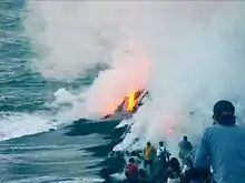 The erupting lava from Piton de la Fournaise met the water of the Indian Ocean during the August 2004 eruption.