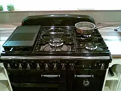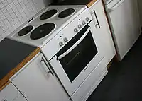 - Kitchen stove – also referred to as a range, a kitchen appliance designed for the purpose of cooking food. Kitchen stoves rely on the application of direct heat for the cooking process and may also contain an oven, used for baking.