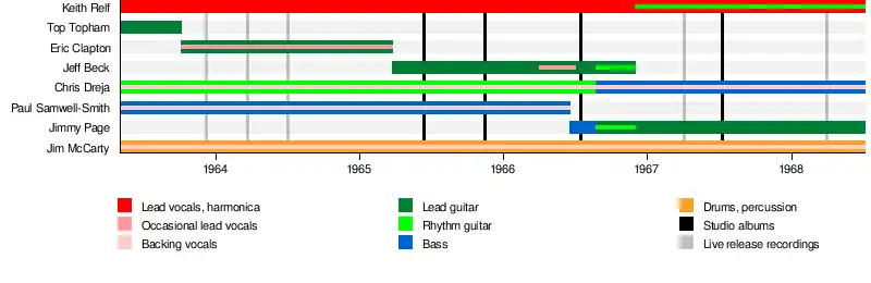 The Yardbirds are an English blues rock band from London. Formed in May 1963, the group originally included lead vocalist Keith Relf, lead guitarist Anthony "Top" Topham, rhythm guitarist Chris Dreja, bassist Paul Samwell-Smith, and drummer Jim McCarty.[1] In October, Topham was replaced by Eric Clapton.[2] He remained until 13 March 1965, when he left due to creative disagreements.[3] Clapton recommended Jimmy Page to replace him, but he declined and Jeff Beck took over.[4] Page later joined on bass the following June, after Samwell-Smith abruptly quit; Dreja later took over the role, allowing Page to join Beck on guitar.[5] This lineup was short-lived, however, as Beck left in November 1966.[6] The group continued as a four-piece until July 1968, when Relf and McCarty left due to creative differences, primarily with Page.[7] Dreja initially remained, but by August, Page formed a new group with vocalist Robert Plant, bassist John Paul Jones and drummer John Bonham, who later renamed themselves Led Zeppelin.[8]