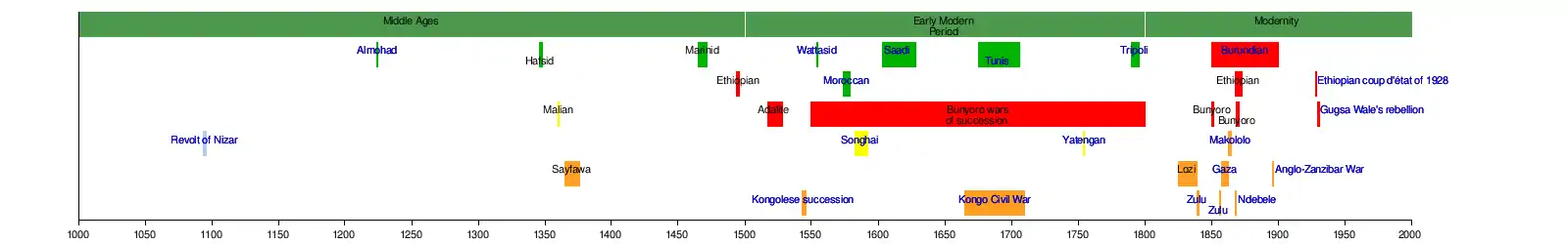 - Several Bunyoro wars of succession in the Empire of Kitara in the 17th and 18th century, almost always coinciding with rebellions in its tributary states[18]