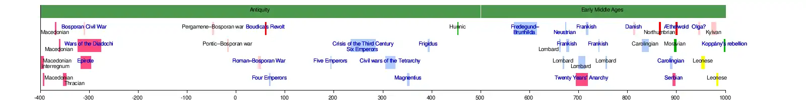 Note: Wars of succession in transcontinental states are mentioned under the continents where their capital city was located. Names of wars that have been given names by historians are capitalised; the others, whose existence has been proven but not yet given a specific name, are provisionally written in lowercase letters (except for the first word, geographical and personal names).