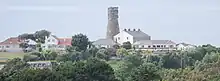 A windmill was standing on this site in 1847.[3] Vale Windmill is a five-storey tower mill that was built in 1850.[12] Photographs show it to have had four patent sails mounted in a canister, and an ogee cap similar in shape to those found in Suffolk, winded by a fantail. The mill had a stage at first floor level.[13] It was converted into an artillery observation post by the Germans during the Second World War. This work entailed a three-storey extension being built on the mill tower, making it 21 metres (68 ft 11 in) high overall.[12] The windmill featured on a 2p postage due stamp issued by the Guernsey post office in 1982.
