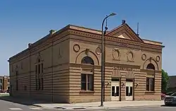The building is a well-preserved example of Renaissance Revival architecture, which is otherwise rare in Litchfield and Meeker County. Most of the facade is yellow clay brick, manufactured locally, and accented with red brick and red terra cotta patterns. The opera house opened on November 8, 1900, with the play "The Marble Heart" starring William Owen. Besides operas and performances, the auditorium housed town meetings, elections, military recruitment, and other government functions. Somewhere between 1930 and 1939, the interior was remodeled for use as city offices. In 1983, when the building was nominated to the National Register, it housed civic offices and organizations, and it was used as a meeting place for senior citizens, the Girl Scouts, and community education. Public officials and the Litchfield Police Department also used some of the rooms.[2] In 2002, the city removed its offices from the building and moved its offices to trailers in the parking lot.[3] This move was made because mold was found in the building. The city completed its new city hall in 2006, but the fate of the building had not been decided yet.[4] In 2008, the city sold the building to the Greater Litchfield Opera House Association, Inc. for $100,000. The city accepted a 1900 silver dollar for payment and specified that the balance of the purchase price would be invested in the building to renovate it for the community.[3]