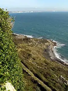 Little Beach is a small secluded beach on the eastern side of the Isle of Portland, Dorset, England; part of the Jurassic Coast. It is found at East Weares, below Grove Point, and is found in close proximity of the two Salt Pans.[1] The East Weares area, including Little Beach, has been labelled a Site of Special Scientific Interest (SSSI), largely due to the surrounding scrub and wildlife being of high nature conservation value.[2]