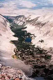 While Little Bear itself has little more than the minimum 300 feet of prominence to qualify as a separate peak, it is notable for being one of the most technically difficult and dangerous of the fourteeners to climb. The upper part of the standard route leads through a 300' section known as the Hourglass: a water-polished granite slab famous for the amount of rockfall.[5] There is another technical route that climbs the northwest face of Little Bear from above the Blue Lakes and gains over 6,200 ft in elevation. The easiest climbing routes on the mountain are on the eastern side, rising out of the private property in Blanca Basin.
