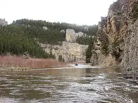 The mountain range of gently rolling peaks and expansive conifer forests contains two large roadless areas. The smaller area, about 92,000 acres (370 km2) in size, is protected as the Middle Fork-Judith Wilderness Study Area.[3] This area includes the Middle and Lost Forks of the Judith River, which cut deep canyons through multicolored limestone cliffs.[4] The Middle Fork-Judith WSA contains over 29 miles of streams containing Yellowstone cutthroat and rainbow trout. Higher elevations are covered in lodgepole pine and whitebark pine, while lower elevations contain ponderosa pine and douglas fir intermixed with grassy parks and meadows. The larger area, encompassing the Tenderfoot Creek drainage, in the western portion of the range, is unprotected and about 108,000 acres (440 km2) in size; it includes some private lands as well as about 98,000 acres (400 km2) of roadless Lewis and Clark National Forest lands.[3] The Smith River Canyon, a popular float trip, is along the western edge of this area.[3]