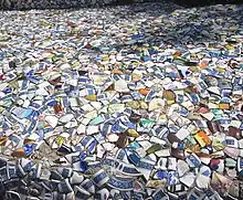 The mosaic style is "pique-assiette" or "Picassiette" (a French term based on a pun blending pique-assiette – literally, plate-pincher, the sort of person crashing into a party to enjoy a free meal – and famous artist Pablo Picasso). According to Mosaic Art Source, "[P]ieces of broken pottery, china, glass, buttons, figurines, and/[or] jewelry are cemented onto a base to create a new surface. Almost any form can be used as a base, and any combination of pieces can be applied, restricted only by the individual creator's imagination."[22] The style was the nickname of a French Art Brut artist, Raymond Isidore, who decorated his house near Chartres, known as Maison Picassiette,[23] much in the same style as the Little Chapel.