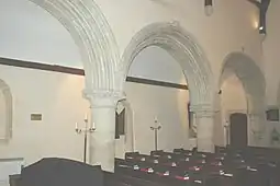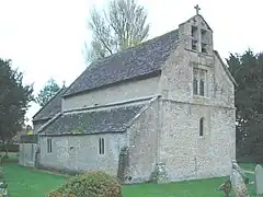 The parish church is Norman, built in the 12th century as a dependent chapelry of Langford.[6] It has Norman lancet windows in the chancel.[7] In about 1200 the church was enlarged with the addition of a north aisle.[7] The arcade between the nave and north aisle is in a transitional style between Norman and Early English Gothic.[8] In the 14th century the porch and south door were added.[9] A south aisle seems to have been added at about the same time but has since been lost.[9] In about 1500 two Perpendicular Gothic clerestory windows were added to south side of the nave. The west window of the nave is also a late Medieval Perpendicular Gothic addition.[9]