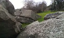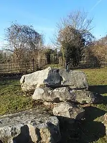 In 2005, Philp and Dutto noted that there were about 21 stones at the site.[3] Jessup called it a "confused group",[1] while the archaeologist Timothy Champion termed it "a jumble".[30] Many of these would have once formed part of a chamber at the eastern end of a long, rectangular earthen mound.[30] Philp and Dutto believed that some of the stones were from the long barrow's chamber and others from its façade, adding that it was "just possible" to suggest which is which.[3]