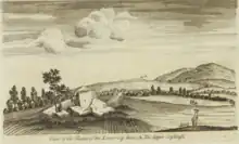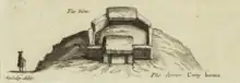 The antiquarian William Stukeley visited the area in 1722.[58] At this point the stones had already been pulled down; from a letter sent to him that year by Hercules Ayleway it appears that the chamber was dismantled around thirty years prior.[59] Ayleway had written that "I have been informed by some who remember it standing that the stones which composed the wall did all of them joyn [sic] close together so as to touch each other, and the dore [sic] was on the west side thereof, next the road."[60] Stukeley produced several illustrations of the site, which were published posthumously.[59] One, produced in October 1722 and used as the basis for a public plate, includes Little Kit's Coty House as a cove in the foreground, while Kit's Coty House — including its barrow — can be seen in the background.[61] However, his depiction of the monument differs in these two illustrations, rendering their accuracy unreliable. Also causing issues is that in Stukeley's illustrations, the chamber entrance is not at the western end, as Ayleway claimed it was.[60]