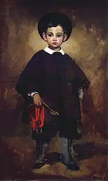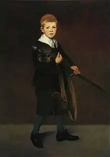 Spanish art and culture were in fashion in the Paris of the 1860s, partly because of Eugénie de Montijo's Spanish origins and partly owing to a Spanish theatre company putting on folklore shows.[9] Early in that decade Manet copied a number of Diego Velázquez's works in the Louvre – he was his favourite Spanish painter. He also knew other works of his such as Infante Don Carlos from reproductions in Charles Blanc's Histoire des peintres de toutes les écoles.[10] The artist's influence on Manet is particularly visible in his Boy with a Sword (1861), who is dressed in 17th-century Spanish costume and shown in matching shades which directly refer back to the Spanish painter, although art historians argue that those shades are not solely down to Velázquez's influence.[9] Others such as Jan Lauts speak of "Spanish black" in Manet's palette.[11] The boy's gaze and the clothes' style and colours are all directly comparable to Little Lange. Both works show a young boy standing in front of a brown background, although Boy is painted in a more classical manner than Lange.