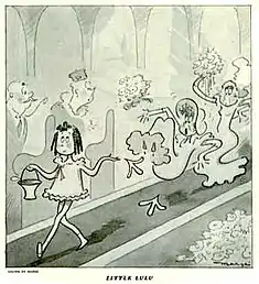 Little Lulu is a comic strip created in 1935 by American author Marjorie Henderson Buell.[1] The character, Lulu Moppet, debuted in The Saturday Evening Post on February 23, 1935, in a single panel, appearing as a flower girl at a wedding and mischievously strewing the aisle with banana peels. Little Lulu replaced Carl Anderson's Henry, which had been picked up for distribution by King Features Syndicate. The Little Lulu panel continued to run weekly in The Saturday Evening Post until December 30, 1944. A later variation of the character is Little Audrey from Harveytoons.