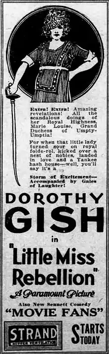 Little Miss Rebellion is a 1920 American silent comedy drama film directed by George Fawcett and written by Harry Carr and Wells Hastings. The film stars Dorothy Gish, Ralph Graves, George Siegmann, Riley Hatch, and Marie Burke. The film was released on September 19, 1920, by Paramount Pictures.[1][2] It is not known whether the film currently survives.[3]