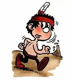 Leo Baxendale created Little Plum in 1953 as a puny cartoon character in a dangerous cartoon world.[2] It first appeared in issue 586, dated 10 October 1953. The comic strip employed a caricature of English language spoken by American Indians, notably replacing the word "the" with "um". Baxendale dreamed him up claiming he was a mixture of Hiawatha and Dennis the Menace and gave him into the editing team. Unsure of the name, Baxendale gave it in to the then Beano editor under the working title 'Booster' before the strip was officially titled 'Little Plum, Your Redskin Chum' .[3] They consisted of Plum, a ten-year-old member of the Smellyfoot tribe and the misadventures he got up to trying to prove himself a valuable member. After Baxendale left The Beano in 1962, Robert Nixon drew a few strips before Ron Spencer took over that same year. The strip originally finished in 1986, but it continued to appear in the Beano annuals up to 1994, and reappeared for a short time in 1998 under the name 'The Legend of Little Plum', drawn by Tom Paterson.