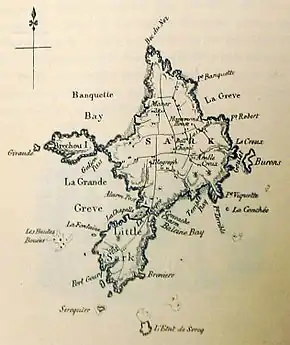 Copper and silver were both mined at Le Pot, close to Pot Bay on the peninsula's east coast. It was here that silver was first discovered in 1833 by John Hunt, although there are earlier claims dating to 1817.[10] Mining only took place for three years before Le Pot was abandoned due to flooding. The severe financial problems this caused almost resulted in the bankruptcy of the incumbent Seigneur, Ernest le Pelley.[11] The Le Pelleys were obliged to transfer the fief to the Collings family, of whom the current Seigneur is a descendant. Remains of this mine can still be seen.