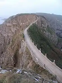 Until the beginning of the twentieth century, access to Little Sark was extremely difficult or, at best, unnerving. La Coupée was traversed by a narrow dirt track, and children are reputed to have had to crawl across it on their hands and knees to prevent being blown over the edge by the wind.[5] According to a description in 1875, "People have thrown themselves flat on their face, from terror and nervousness on reaching the Coupée; others have lost courage half way across, and have hidden themselves behind the heads of the rocks that crop up in the middle of the Coupée until some passer by came and led them along; others have been unable to get across without shutting their eyes and being led between two persons." On 4 September 1802, Elie Guille of the Clos-à-Jaon was carrying sheaves of corn across La Coupée for the payment of tithes. He was blown over the East side and killed. After that the Seigneurs farmed out the collection of tithes in Little Sark to an individual in Little Sark who could settle the dues in cash. There were for a long time arguments between the inhabitants and the Seigneur over whose responsibility it was to maintain the path across La Coupée. In 1811 a landslip reduced the width of the path to no more than 3 feet. Finally in 1812 an act of agreement was signed between the parties to ensure every male inhabitant subject to the ordinary repairs of the road would give two days' corvée to the La Coupée road and in return the Seigneur would guarantee to provide all remaining expenses. Following another landslip in 1862 on the Little Sark side a retaining wall was constructed so as to provide a foundation for a roadway 8–10 feet wide. However the narrowness of the path and the vertiginous drop were not the only things that made many wary of crossing La Coupée, especially at night, as the locality was reputed to be haunted. Strange moaning sounds or unearthly shrieks have been reported; however, these have been explained away as being due to the actions of wave and tide in La Caverne des Lamentes in the bay.[6] The black dog called the Tchico was also reputed to haunt La Coupée as it ran the roads of Sark. Sibyl Hathaway, Dame of Sark, recorded that some of the Islanders believed that the reason why her donkey would not cross La Coupée was because of sensitivity to the presence of the Tchico.[7]