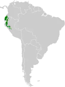 The little woodstar is found from extreme southwestern Colombia through western Ecuador into northern Peru and discontinuously in eastern Ecuador and north central Peru. It inhabits the transition zone between semi-humid and humid deciduous forest. In elevation it ranges from sea level to 2,300 m (7,500 ft) in western Ecuador and between 900 and 3,000 m (3,000 and 9,800 ft) in eastern Ecuador and Peru.[6]