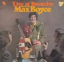 It was decided that the recording would be a live take of one of his dates on a pre-arranged tour, and the venue of Treorchy Rugby Club was chosen. Despite the admission fee being only 50 pence, uptake was low and an audience was rounded up by offering free entry to people in nearby pubs.[1] Amongst the audience were members of the Treorchy Male Voice Choir, who added volume during the sing along choruses.[1] EMI had sent a three-man unit to record the show, including Abbey Road sound engineer Phil Hancock, who set up the mixing desks in the club changing rooms.[1] Recorded on 23 November 1973, Boyce was supported on the day by Welsh band Triban and the concert was compered by broadcaster Alun Williams, though neither appeared on the finished album.[1] Live at Treorchy album was completed in one take on one night, with the finishing mix completed at Abbey Road Studios.[1][2]