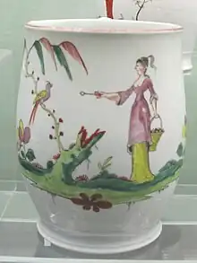 Richard Chaffers made soapstone-type porcelain featuring mainly Oriental designs at Shaw's Brow. An advertisement for it in 1756 provides the earliest documentation of Liverpool porcelain production, which he continued until his death in 1765. In 1756 he also held a licence to mine soapstone at a site in Cornwall.[1] The porcelain resembles Worcester porcelain. Most of the plates made by the factory are octagonal, and some tea and coffee sets are six-sided. A common product was a bulbous mug with an incised cordon above the foot, enamelled with a Chinese scene in polychrome. Philip Christian & Co took over the factory when Richard Chaffers died and produced similar designs until 1778.