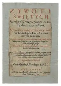 The book was published in two volumes with over a thousand pages total.[1] Skarga, inspired by some other historiographical works (ex. it is estimated he based at least four-fifths of his work on the translation of Laurentius Surius De probatis Sanctorum historiis),[2] wrote this book in 1577, in order to combat the popularity of Protestant writings and advance the cause of the Counter-Reformation.[1] In particular, Skarga recommended that this book should be read instead of the Holy Bible, reading of which at that time the Catholic Church did not encourage (unlike the Protestants).[3]