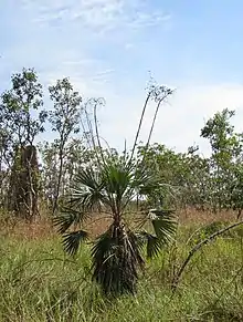 Livistona humilis, the sand palm, is an Australian plant species of the family Arecaceae. It is a small, slender palm, growing to about 7 m tall and 5–8 cm dbh. It has 8 to 15 fan-shaped leaves, 30–50 cm long with petioles 40–70 cm long. It is endemic to the Top End of the Northern Territory in Australia. Genetic investigation suggests that its closest relative is Livistona inermis.[2] This palm is fire tolerant and usually grows in environments where it is exposed to frequent fires.[3]