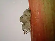 L. concavus has a distinctive long snout and geniculate antennae with small clubs. The beetle is about half an inch in length, black, covered with yellow dust, and hibernates as an adult.[4][5] Eggs are a yellow-white colour and oblong in shape; the legless larva is a grub, about 3/4 inch in length, with a brown head that usually bears an inverted, Y-shaped mark.[6]