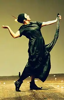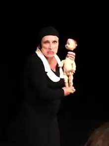 Slap and Tickle was structured in three acts, 'using a visual and aural collage of movement, text, props, costumes (Holly Murray), sound (Joe Murray) and cover versions (Alan Boorman/Wevie)'.[57] The first act explored the world of the girl-child and 'the insidious nature of the fairy tales and nursery rhymes than reify societal mores'.[58] Referencing Cinderella, Aggiss wore silver slippers and a gorgeous old-gold party dress.'[8] The second act, on the adult woman, began with her wearing 'a chic New Vogue black-and-white dress, striking high fashion poses' and ended with 'a genuinely disturbing turn with a misshapen puppet, which Aggiss dangles from a noose over her shoulder as she describes the journey of a woman who experiences pregnancy, abortion, childbirth and bad motherhood.'[58] The third act, on the older woman, ended with her 'crawling on all fours to 'Smack My Bitch Up', bare-arsed with a pony tail waving over her bum, a faint sly smile playing over her lips.'.[58] Dorothy Max Prior described the ending as 'a fabulous moment of emancipation and celebration of the older female body.'[8]