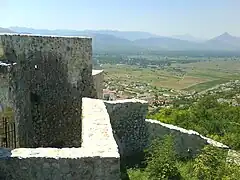 The medieval fortress consists of a massive quadrangular tower, called Herceguša, which dominates the fortress and a stable in front of the tower. The tower's external dimensions are 9.7 with 5 meters, with the walls 2 to 4 meters thick. There were loopholes at the top of the tower, which are no longer there. The north wall of the tower has been preserved up to the roof, at around 15 meters. The side walls have largely collapsed, while the southern longitudinal wall was demolished by an earthquake in the 1960s. Along the eastern half of the southern wall of the tower are steps connected to the eastern wall of the enclosure, while the stairs leading to the tower are buried by stones collapsed from the southern wall of the tower during the earthquake. The podgrađe has most likely developed on the Crkvice terrace, which is located under the southern part of the town. A later town developed in the valley west of the fortress.[2]