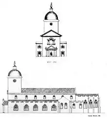 John Wood's plan to complete his work at Llandaff Cathedral. The eastern portion of the building, seen at right, is where Wood actually did work. The western portion, at left, is the porch and tower Wood proposed but never constructed.