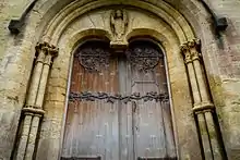 The door of the west front of Llandaff Cathedral; a statue of St Teilo is seen above the door.