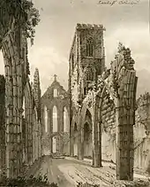 Thirty years after the cathedral roof collapsed, the chapter asked an architect, John Wood, the Elder, to prepare estimates and plans to restore the cathedral.[46] In 1734 work began on a new cathedral, designed by Wood.[47] Wood produced an Italian temple[48] style edifice, working only on the eastern portion of the building, while leaving the remaining western half in ruins.[46] What Wood was trying to build at Llandaff was not Italian, but a recreation of Solomon's Temple.[49] Another sixteen years passed before the chapter solicited funds to repair the western half of the building.[50][lower-alpha 13] Wood's plans were to replace the western entrance of the cathedral with a tower and rustic porch.[51] No changes were made to the western entrance until Wyatt and Prichard began their work in 1841, when the damage to the western portion of the structure was repaired and all traces of the Italian temple work by Wood had been removed from the cathedral.[52][53][lower-alpha 14]