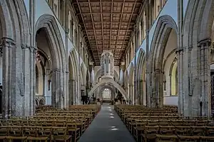 The original pre-Norman church was recorded in the 12th-century Book of Llandaff to have been no more than 28 feet (8.5 m) long, 15 feet (4.6 m) wide and 20 feet (6.1 m) high. It contained low, narrow aisles with an apsidal porticus measuring 12 feet (3.7 m) long.[93] Construction began of a grander building under the orders of the second Norman bishop of Llandaff, Urban, in the 1120s, to administer power over the newly formed diocese. It doesn't appear to have lasted long as an extensive construction was ordered between 1193 and 1218 during the episcopate of Henry of Abergavenny. The western parts replaced those that Urban had built, and the nave and front of this side remain today. The fine craftsmanship and subtlety of the architecture show a clear similarity to those of Glastonbury Abbey and Wells Cathedral, so it is probable that several of the leading craftsman of Somerset were hired for the building.[93]