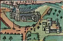 A depiction of the cathedral from Speed's 1610 map of Wales