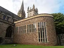 The south side of the nave is characterized by eight bays with stepped buttresses between them, with aisle windows featuring reticulated heads.[87] At the side of the south aisle of the sanctuary is Chapter House, a small, two-story square building. It dates to the mid 13th century[97] and is made from Chipping Camden and Bath limestone, with some local red sandstone from Radyr.[87] The octagonal roof was the brainchild of Prichard, though it was lowered in pitch by Pace and later worked on by Donald Buttress. The buttresses of the building are made from ashlar. The seven stained-glass roundels are of 16th-century Flemish origin. In the interior is a pulpit featuring Moses.[97] Also of note is the St David's Chapel, added by George Pace in 1953–1956, which is accessed through the Norman north door of the cathedral.[87]