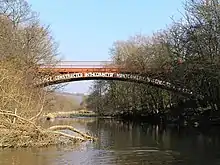 • Brynderwen Bridge. Built in 1852, close to Abermule, this is a single 109-ft span across the river Severn (and a smaller span across the canal) on five iron girders. Designed by Thomas Penson. The bridge came from Brymbo ironworks near Wrexham, and would have been transported to the site by the Montgomeryshire Canal. Grade II* listed.[44]