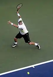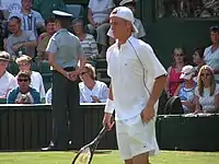 Hewitt returned to form the following year, equalling his career-best of reaching seven singles finals in the one season and compiling his best ever single-season win-loss record in grand slam singles play (17–4). In May, he reached his second quarterfinal at the French Open, losing to the eventual champion Gastón Gaudio in straight sets[19] before reaching his second consecutive grand slam quarterfinal at the Wimbledon Championships where he lost to the World No. 1 and defending champion, Roger Federer in four sets.[20] He also enjoyed a stellar US Open series campaign as he reached his second final at the Cincinnati Masters[21] and won titles in Washington D.C. and Long Island respectively[1] before reaching his second US Open final and third grand slam singles final where he lost to Federer in straight sets.[22] He finished the year by reaching his third final at the year-ending Tennis Masters Cup, once again losing to Federer[23] and ended the year ranked World No. 3. Hewitt began the 2005 season by winning his fourth title at the Medibank International, becoming the first player to win that many titles at the event since John Bromwich in 1940[24] before defeating Rafael Nadal,[25] David Nalbandian[26] and Andy Roddick[27] en route to his first Australian Open final where he lost in four sets to Marat Safin.[28] By reaching the final, Hewitt had now reached the quarterfinals or better at all four grand slam events and had also become the first male Australian player to reach the Australian Open singles final since Pat Cash in 1988.[27] The remainder of Hewitt's year was highlighted by a finals appearance at the Pacific Life Open[29] and semi-final appearances at the Wimbledon Championships[30] and US Open;[31] he lost on all three occasions to the World No. 1, Roger Federer. Hewitt qualified for the year-ending Tennis Masters Cup for the fifth time in his career but withdrew from the event as his wife was due to give birth to their first child.[32] He ended the year ranked World No. 4, which remains his last finish in the year-end top ten.