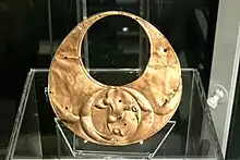 The Llyn Cerrig Bach Plaque[1] is a bronze plaque which may have been used to decorate a shield.[2] that dates between 200BC and AD100. It was thrown into Llyn Cerrig Bach, Anglesey (Ynys Môn). The three legged triskele symbol, which may be inspired by a puffin,[3] and also referred to as a trumpet motif,[4] could represent the living, the dead and the gods or the cycle of birth life and death.[5]