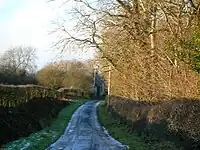 A lane at one time came from Carnell Castle[14] (previously Cairnhill), circled round and through Ladeside clachan, and then proceeded directly to the main road from Kilmarnock to Mauchline; the A76 Carlisle Road. The road now passes by the present Laidside, a smallholding and the only house left of the old hamlet, alongside the cutting in which the burn now runs, to join the Galston Road that passes through Crosshands. Before the war, a large plantation of tall trees hid Crosshands from view; this has now been largely felled.[8]