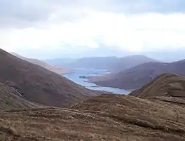 Loch Cluanie (Scottish Gaelic: Loch Cluanaidh) is a loch in the Northwest Highlands of Scotland at the south-east end of Glen Shiel. It is a reservoir, contained behind the Cluanie Dam, constructed by Mitchell Construction and completed in 1957 as part of the North of Scotland Hydro-Electric Board's Glenmoriston project to generate hydroelectricity.[1] Water feeds the dam from the west via two flows, from a tunnel from the dammed Loch Loyne and via the River Moriston.[2]