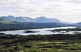 ![]() The view from the path that crosses Rannoch Moor. The small wooded island is Eilean Lubhair, whilst in the distance are the Munro's of Beinn a Chreachain and Beinn Achaladair with the flat topped Meall Buidhe between them. | |