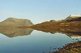 Lochan Fada lies almost directly north of Loch Maree running in a parallel direction, separated by a boggy plateau that runs the length of Loch Maree and constitutes the majority of Letterewe Forest.[3] The plateau is bounded by Slioch, one of Scotland's Munros, known as "The Spear" at 981 metres (3218 feet) that dominates the south-eastern end.[4] In the middle of the plateau is Beinn Lair at (859 m) with several smaller peaks at the north-western end with the highest being Beinn Airigh Charr at 792 m. Within the ridge is small remote Loch Garbhaig that lies below the northen cliffs of Slioch.