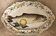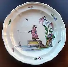 The Coppellotti factory was active from 1641 to the end of the 18th century; the best ceramics date back to the period 1735-1740 and were produced with the gran fuoco technique: plates, centerpieces, teapots, coffeemakers, sugar bowls.[7] Some of the decorative motives were influenced by French ceramics, in particular the decoration known as 'De lambrequins et rayonnants', introduced from Rouen, with arabesques, draperies and geometric-floral compositions arranged in a radial pattern. Most of these ceramics are in turquoise monochrome.[7] There are also many other original polychrome decorations representing fruit, fish, landscapes, castles, peasants, wayfarers, music players, oriental figures, accompanied by animals, such as birds and dogs [7]