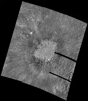 The crater and the area immediately adjacent to it are divided in a number of geological units. They include an approximately circular and relatively bright central zone, an asymmetrical ring of mountainous and hummocky terrain around it, which is thought to correspond to the degraded crater rim. Beyond the crater rim there are two concentric outer rings made of bright and dark impact ejecta deposits.[3]